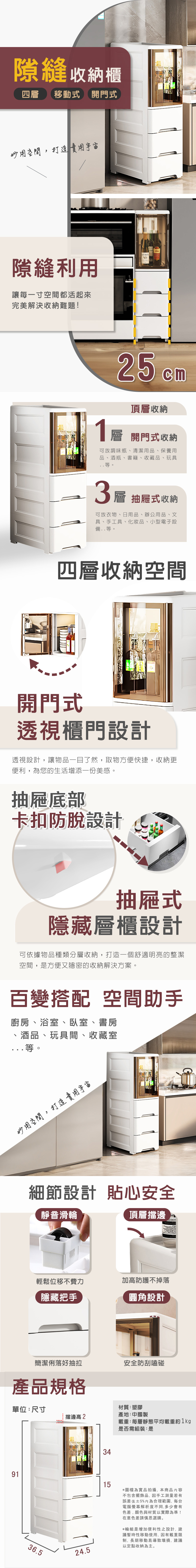 面寬25CM四層移動式帶門縫隙收納櫃(附輪組)