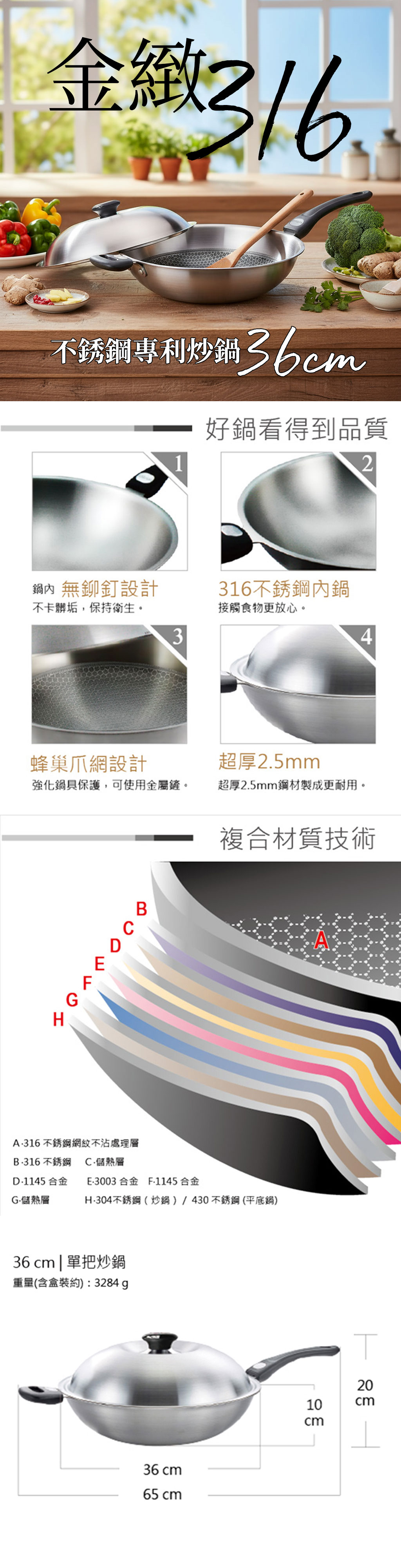 PERFECT 金緻316不銹鋼專利不沾炒鍋36CM (附蓋) KH-15336-1