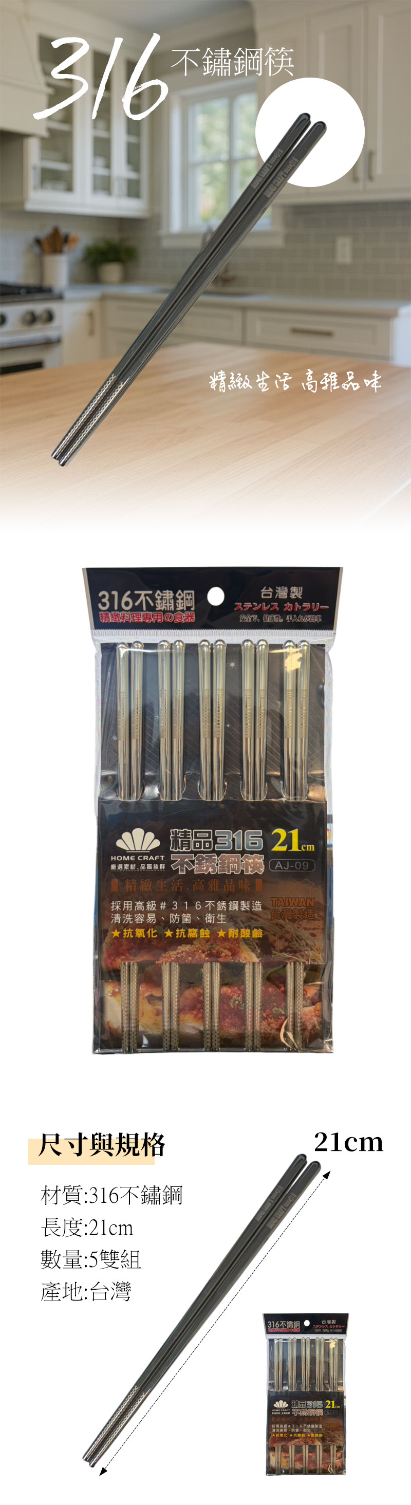HOME CRAFT 精品316真空筷21CM 五入 AJ-09