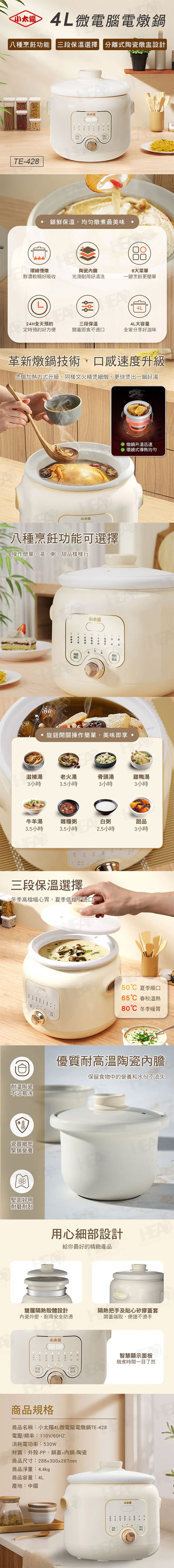 4L大容量,旋鈕開關操作簡單 分離式陶瓷燉盅設計,清洗更容易 三段保溫選擇,滿足不同季節溫度需求 雙層隔熱殼體、把手,貼心矽膠上蓋,安全防燙 立體環繞加熱,均勻燉煮最美味 24小時定時預約功能,料理好方便