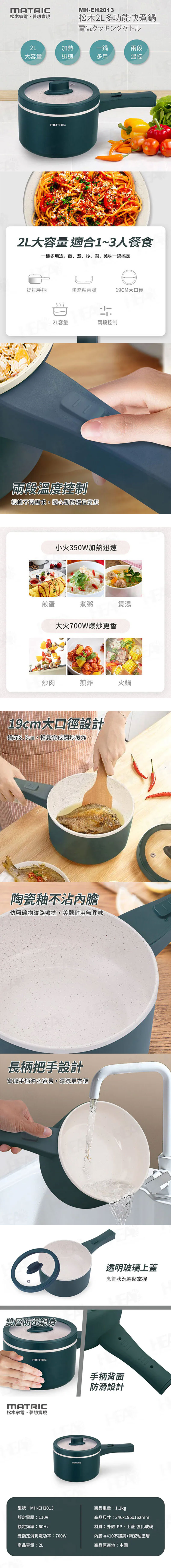 透明上蓋,煮食看得見。 兩段溫度控制,操作簡單。 2L大容量,適合1~3人餐食。 雙層防燙鍋身設計,貼心不燙手。 過熱保護裝置,使用更安全。 陶瓷釉內膽,耐用不沾黏。 19cm大口徑搭配8.5cm鍋深,輕鬆完成翻炒煎炸。