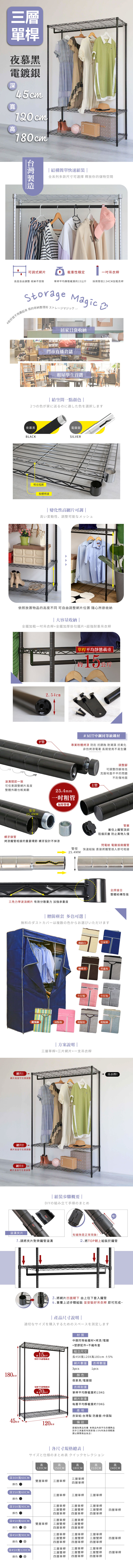 45X120X180CM 三層吊衣架組贈布套 烤漆霧黑│明亮電鍍