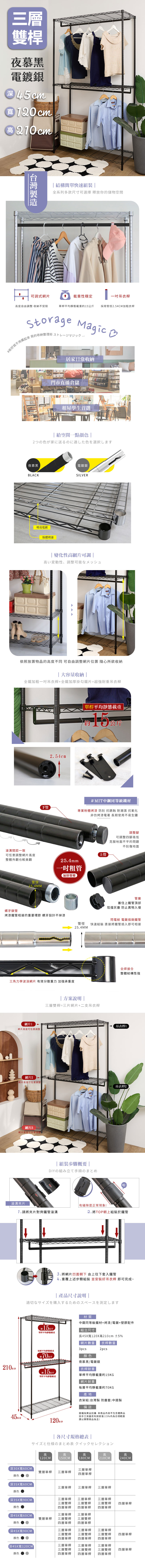 45X120X210CM 三層雙桿吊衣架組 烤漆霧黑│明亮電鍍